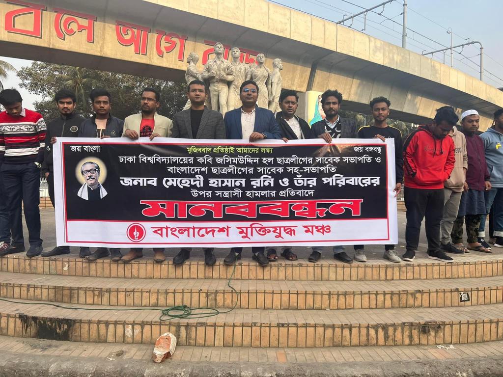টাঙ্গাইলের ধনবাড়িতে ঢাকা বিশ্ববিদ্যালয়ের কবি জসীম উদ্দিন হল শাখা ছাত্রলীগের সাবেক সভাপতি ও কেন্দ্রীয় ছাত্রলীগের সাবেক সহ-সভাপতি মেহেদী হাসান রনির বাসভবনে ন্যাক্কারজনক সন্ত্রাসী হামলার প্রতিবাদে আজ ২০ জানুয়ারী শনিবার বিকাল ৪টায় ঢাকা বিশ্ববিদ্যালয়ের রাজু ভাস্কর্যের পাদদেশে মানববন্ধন ও প্রতিবাদ সমাবেশ কর্মসূচী পালন করেছে বাংলাদেশ মুক্তিযুদ্ধ মঞ্চ।
