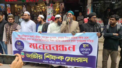 জাতীয় শিক্ষক ফোরাম পাবনা পশ্চিম জেলা শাখার আয়োজনে আজ (২৫ জানুয়ারী-২৪) বৃহস্পতিবার দুপুর ১২.৩০ ঘটিকা হতে পাবনা প্রেসক্লাব চত্বরে মানববন্ধন কর্মসূচি পালন করা হয়। নতুন কারিকুলামে অসঙ্গতি দূরীকরণ, পাঠ্যপুস্তক…